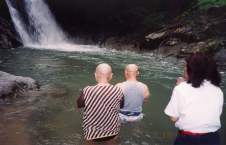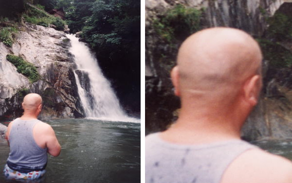 平成十六年八月吉日に、佐賀県の七山村の観音の滝で、水につかって般若心経と南無大師遍照金剛を唱えると、不思議に弘法大師が住職の後頭部に現れた。